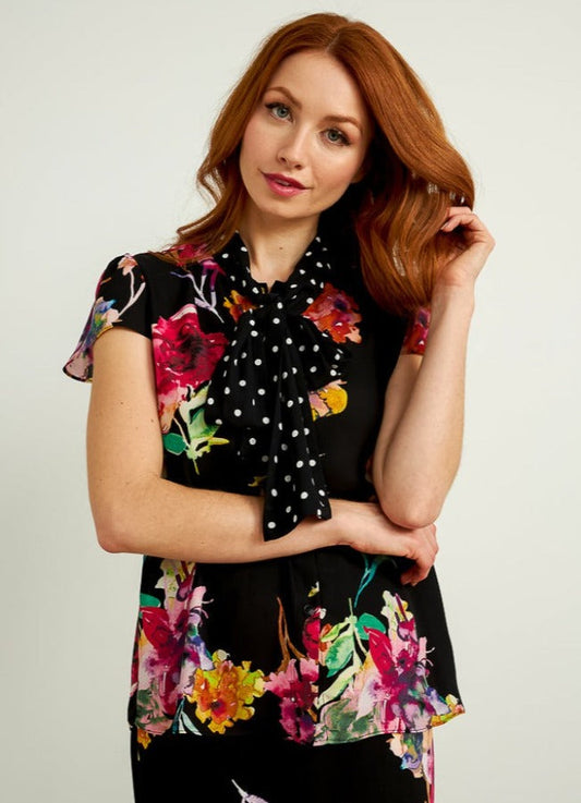 Joseph Ribkoff Black/Multi-Color Floral Print Bow Chiffon Top 212091