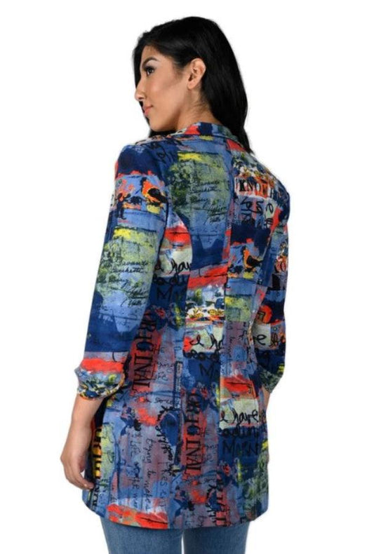 Frank Lyman 231303 Blue/Red Abstract Print Open Front Blazer