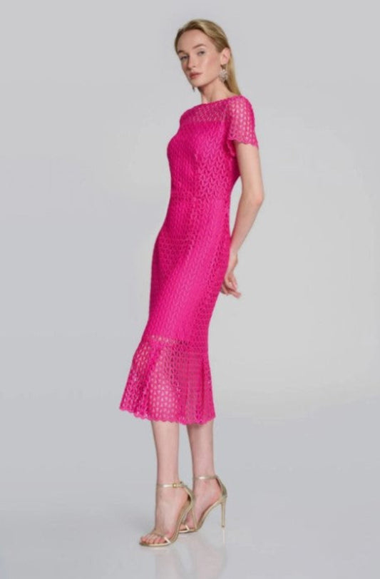 Joseph Ribkoff 242704 Shocking Pink Lace Midi Trumpet Dress