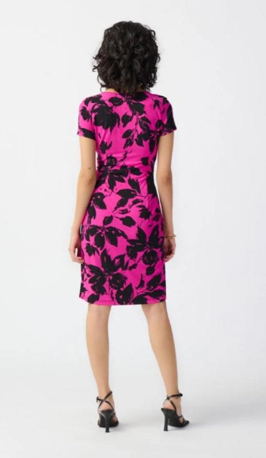 Joseph Ribkoff 241118 Pink/Black Floral Print Ruched Faux Wrap Sheath Dress