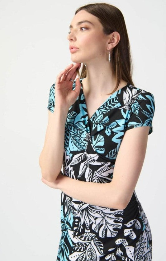 Joseph Ribkoff 241287 Black/Multi Tropical Print Faux Wrap Sheath Dress