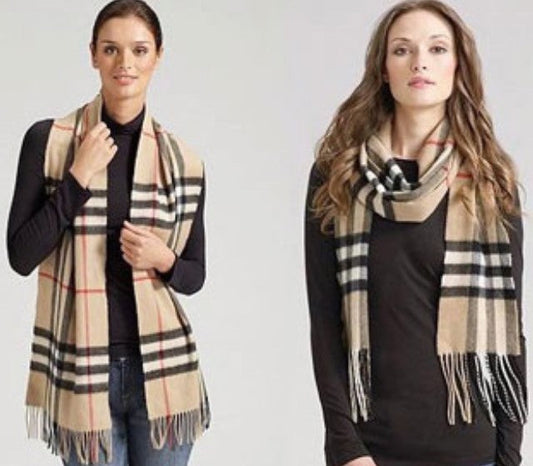 Cashmere Reversible Pointed Scarf- Tan/Blue Print