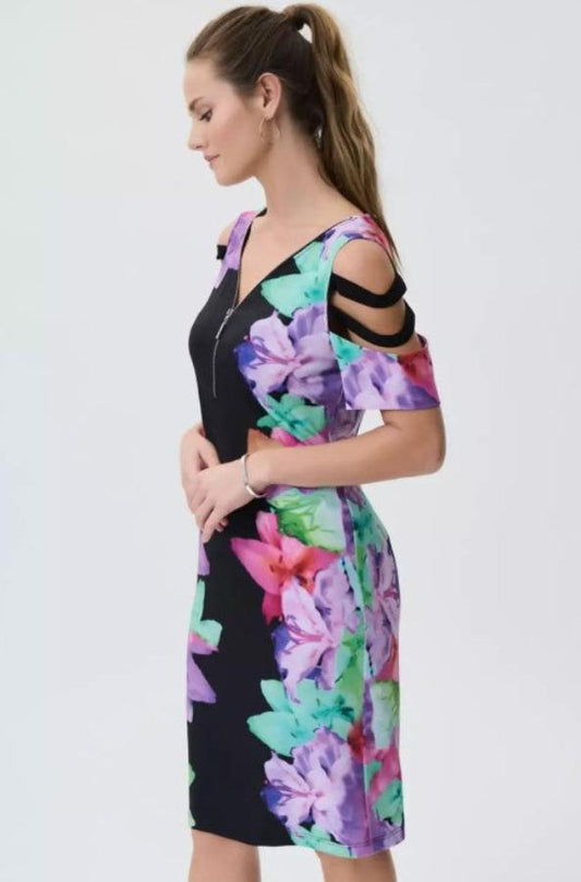 Joseph Ribkoff 231226 Black/Multi Floral Print Cold Shoulder Sheath Dress
