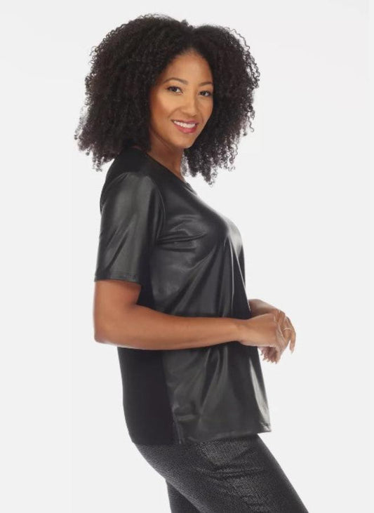 Joseph Ribkoff 233281 Black Faux Leather Front Short Sleeve Top