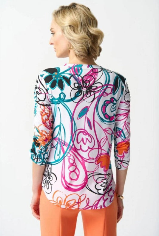 Joseph Ribkoff 242179 Vanilla/Multi Floral Paisley Scribble Print Shirred Top