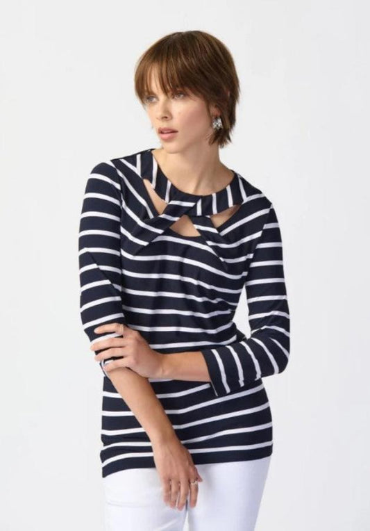 Joseph Ribkoff 241087 Midnight Blue/Vanilla Striped Cutout Detail Top