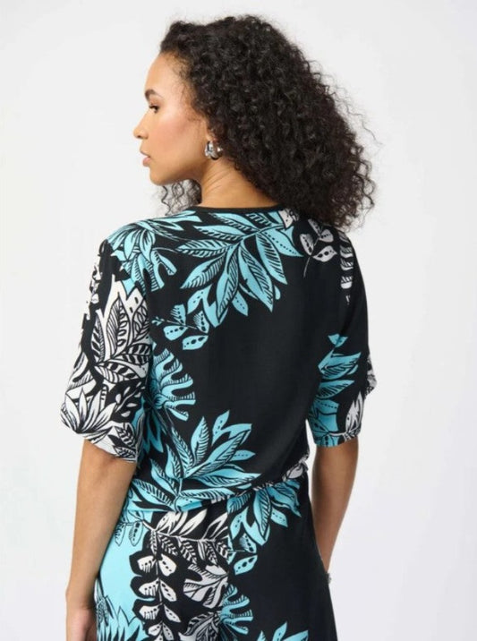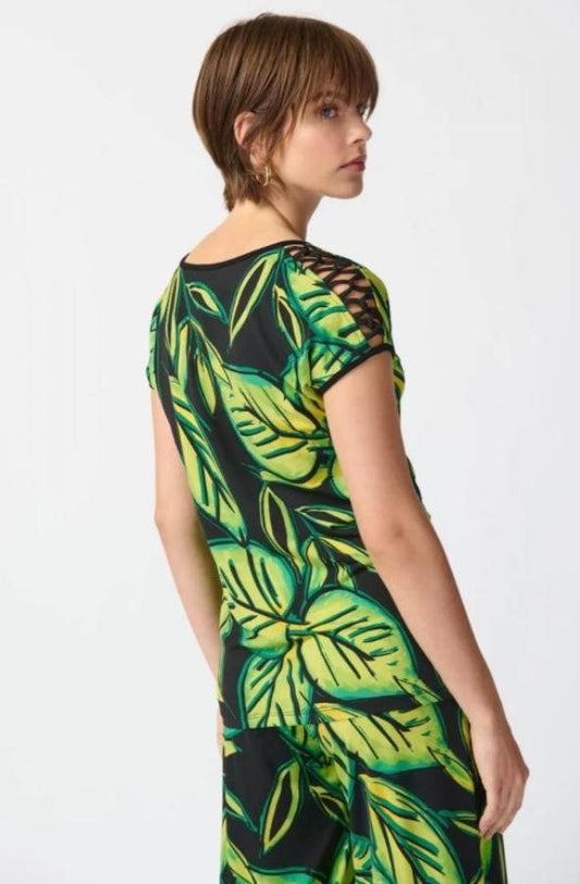 Joseph Ribkoff 241244 Black/Multi Tropical Leaf Print Criss Cross Cold Shoulder Top