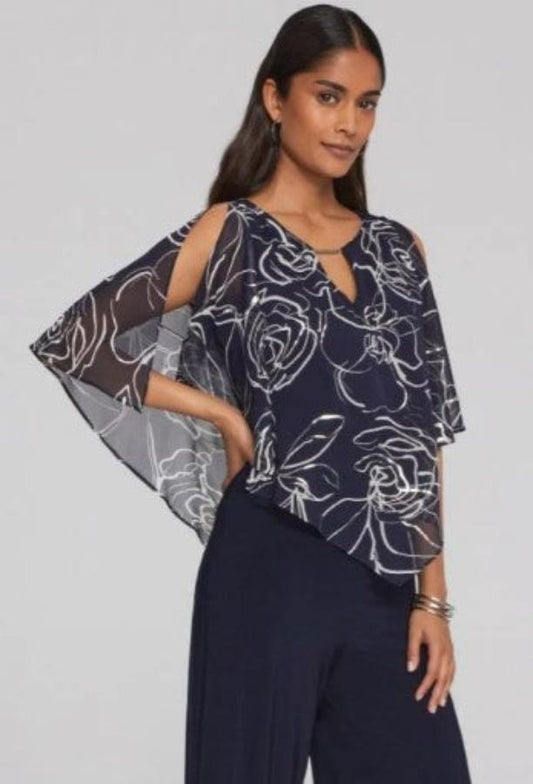 Joseph Ribkoff 241783 Midnight Blue/Vanilla Floral Print Chiffon Split Poncho Top