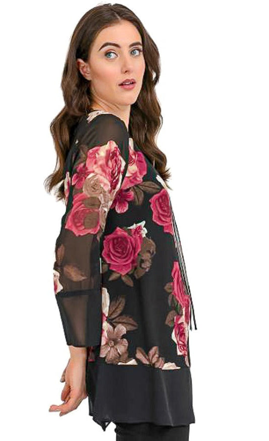 Joseph Ribkoff Black/Wine Floral Print Sheer Zipper Tunic Top - 194680