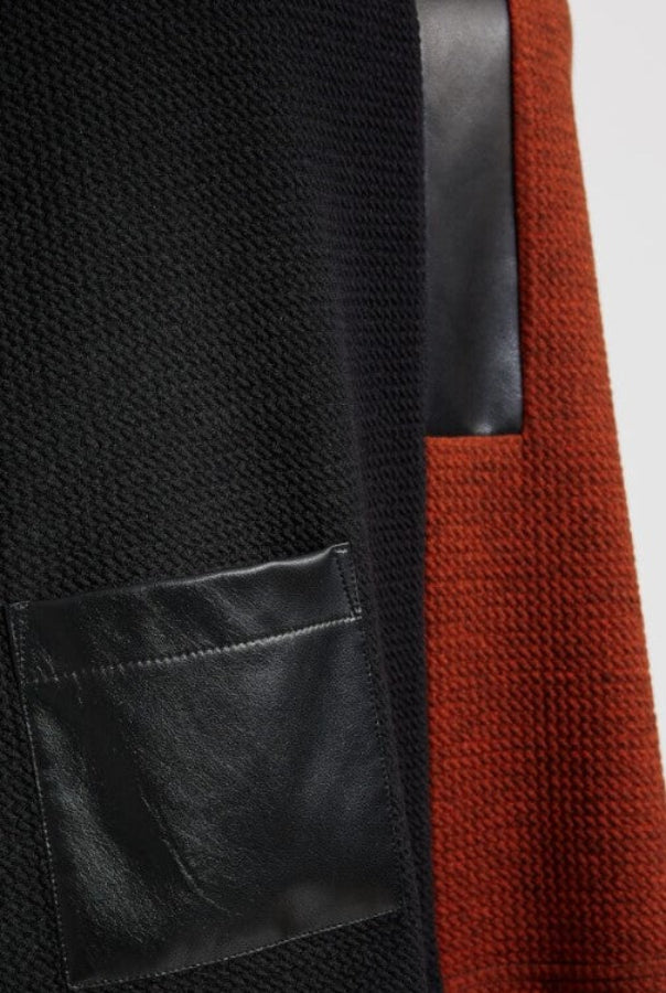 This top is designed in black/tandoori two-tone with a round neckline and dolman sleeves. It also features a faux leather side pocket and panel on the front with a hip-length hem.