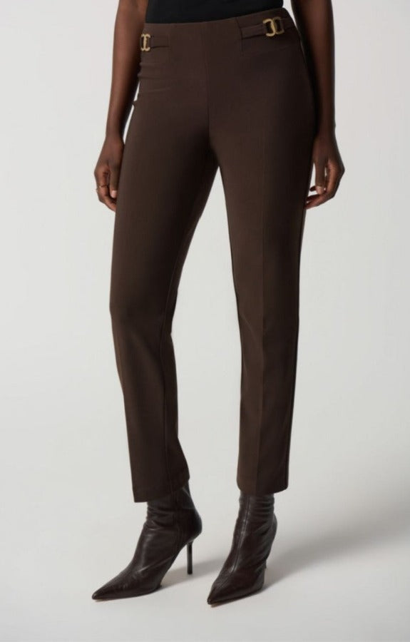 These pants are designed in a solid color with buckle ornaments on the waist. They also feature a pull-on style with an elastic waist and an ankle-length slim straight leg.