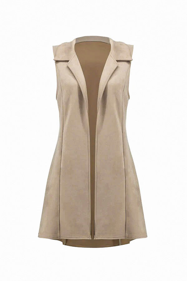 This vest is made of a solid color faux suede fabric. It also features an open front with a collared neckline, sleeveless, and a hem that falls mid-thigh.