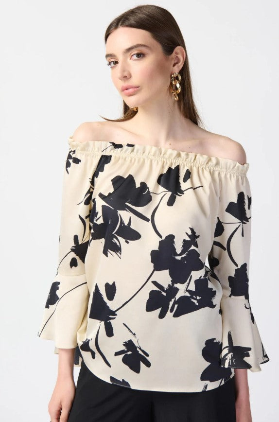 This top is made of lightweight satin and is designed in a solid color with contrasting floral silhouette print. It also features a shirred off-shoulder, bell sleeves, and a rounded hem that hits the hip.