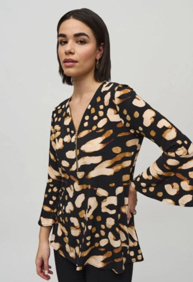 This tunic top is made of silky knit fabric and is designed with an animal print throughout. It also features a V-neckline with partial zipper closure, bell sleeves, and a rounded hem that is slightly longer at the back.