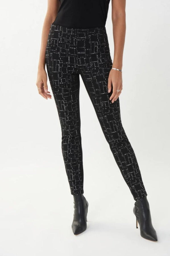 These pants are designed in a solid color with a metallic abstract pattern at the front. They also feature a pull-on style with an elastic waist and a slim ankle-length leg.