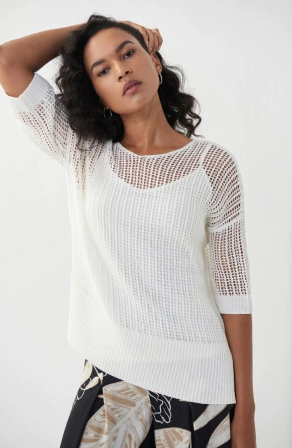 This sweater top includes an inner cami and an open-knit outer. It also features a V-neckline, 3/4 sleeves, and a hem that hits the hip.